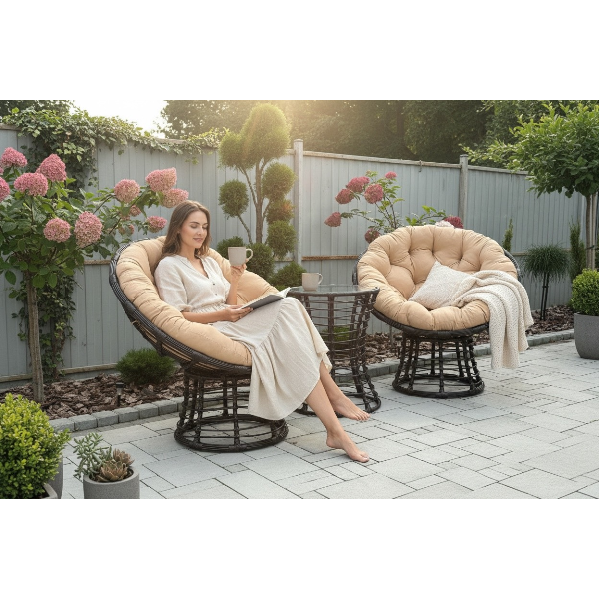 Набір меблів «PAPASAN-LINE» - стильні і неймовірно комфортні крісла, круглої форми. Сидіння крісла утворює чашу, яка кріпиться до основи ременями. Така конструкція дозволяє змінювати нахил сидіння аж до горизонтального, закріпивши ремені в потрібному положенні.